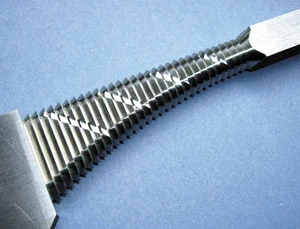 Generating the program in UGS NX CAM took approximately two hours for the bone rasp (shown in picture). The time required is largely dependent on the number of teeth and the contour shape. There were 48 teeth to grind which required individual sheet bodies to be modelled, ensuring that wheel position and depth would be correct all the way around the contour profile. The model of the fixture was also required to ensure wheel collision would be avoided as the wheel approached this section of the rasp.
