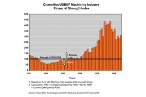 The Charmilles/USBEF Machining Industry Financial Strength Index was started in October, 2004 and is made up of reactions to a survey of machine tool users about their current business levels versus the previous three months. "The U.S. economy is clearly reacting to high interest rates and oil prices," observes Harry Moser, president of Agie Charmilles Corp. "Tooling (molds, stamping dies and extrusion dies) appears to be holding up better than production. If the recent weakening of the U.S. dollar continues and the Federal Reserve does not attempt to strengthen the dollar with higher interest rates, long term manufacturing growth is likely." Looking at the figures, historical data shown in Figure 1 is a Financial Strength Index. As Charmilles explains, any reading above 100 indicates that U.S. Bankcorp Equipment Finance's (USBEF's) machine tool lease payment delinquencies (a good measure of liquidity and consistent profitability) are at a rate below the average rate of 1990 to 1999. As profitability rises, liquidity rises, delinquencies fall and the Index rises. Figure 2's Machining Business Activity Index is based on data available for it – and for Figure 1 – that's available for viewing at the Charmilles web site: www.$1.com/ newsroom/bizindex.cfm. For the chart, any figure above 50 indicates an improvement in business activity.