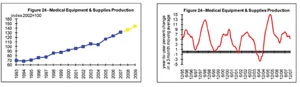 Medical equipment and supplies production is made up of surgical and medical instruments, surgical appliances and supplies, and dental laboratories. The industry has a relatively consistent record of growth, with trated in surgical and medical instruments. Surgical appliances and supplies are growing modestly, and dental laboratory production is declining. Medical equipment and supplies is relatively balanced in its trade account; imports about equal exports. In 2007 exports and imports both increased 11%. Medical equipment and supplies production is expected to grow 3% in 2008 and 7% in 2009.