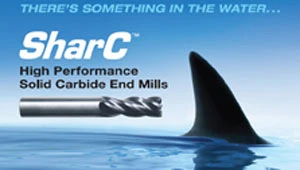 The SharC line features three product families. First is Mako, which is the "fastest, most agile" tool for cutting straight and corners in non-ferrous and aluminum metals. Next is Tiger, the multipurpose "eats anything" tool for roughing, slotting and semi-roughing ferrous metals and high temp steels. Then there is the Megamouth for finishing and semirough profiling of the "toughest" steel and nickel-based alloys. In addition to the three endmills, custom angles can be manufactured upon request.