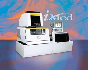 FANUC iMed wire EDM machine is configured for continuous-duty production of parts. The iMed offers cutting speeds, accuracy, surface finishes and advanced features. It is ideal for the production of surgical instruments, needles, stainless steel tubing and rods, turbine engine vanes and blades, orthopedic implements, dental tools and devices, laboratory equipment components, and PCD tooling/tips.