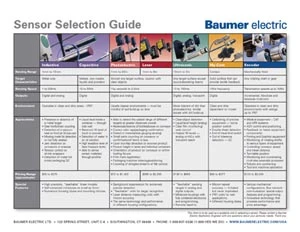 An-easy-to-use, one-page Sensor Selector Guide from Baumer Electric allows users to quickly choose the appropriate sensor technology for their specific applications. The Guide focuses on inductive, capacitive, photoelectric, laser, ultrasonic, encoder and My-Com sensor technologies.