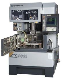 Sodick's new AQ300L Medical Device Center (MDC) submersible wire EDM with indexing axis is based upon the industry proven Sodick linear Motor EDM platform. This affordable cost wire EDM is an ideal solution to the EDM-ing of medical devices and instruments and comes with many features that are seen on more expensive models. Standard features include an indexing axis, X, Y, U, and V linear motor drives with glass scale feedback, auto wire threader, electrolysis free circuit, and a large 15 in. LCD touch screen monitor. The AQ300L MDC's compact design of 4 ft. x 8 ft. allows it to be installed in most shops. Additional machine specifications include 12 in. x 8 in. x 8 in. X, Y, Z axis travels, maximum workpiece dimensions of 20 in. x 12 in. x 8 in., and U, V travel of 3.2 in. x 3.2 in.
