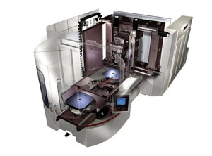 Cincinnati Machine will introduce its new MEGA5-800 5-axis horizontal machining center, utilizing the basic MEGA twin ballscrew-driven axes configuration in X-Y-Z and the basic MEGA B-axis table. The new 5-axis model incorporates an extremely compact A-axis tilt-spindle with 180° sweep, providing precision, 5- sided machining capability for high quality, economical part processing, as well as full 5-axis contouring for processing highly complex parts. With its extended Y-axis, the MEGA5 offers 1,425 mm of X-Axis travel, 1,325 mm of Y-Axis travel, and 1,265 mm of Z-Axis travel, providing the range and part capacity to meet a variety of customer needs. Part sizes up to 1,300 mm (51.2 in.) diameter a n d 2 , 0 0 0 mm ( 7 8 . 7 i n . ) h i g h , weighing 2,200kg (4,840 lbs) can be accommodated. The machine's feed rate of 60 m/min (2,362 ipm) and 1G (386 in/s²)(9.8 m/s²) acceleration/ deceleration rate provide high quality metal cutting performance. The MEGA5 is available in machine configurations suitable for cutting a variety of materials. The XT spindle configuration is intended primarily for hard metal applications. The XT spindle package is available with a geared spindle providing a base speed of 375 rpm and a maximum speed of 6,000 rpm. Duty rated at 45 kW (60 Hp)/1,146 Nm (845 ft-lb) and continuous rated at 37 kW (50 Hp)/942 Nm (695 ft-lb), it is offered in either HSK 100A or ANSI 50 (ISO 7388.1) versions. Cincinnati Machine has also developed a comprehensive package covering machine dynamics, tooling, coolant delivery, chip handling, and even raw material characteristics regarding titanium. The MEGA5 has been equipped with a combination of features that yields throughput increases of 50 to 100-percent compared to conventional processes.