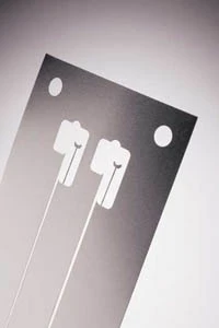 There remained ED wire cutting which with its reproducible precision was the process suitable for cutting these parts. For this purpose, 50 foils were stacked at a time and pressed between two thicker plates. This had a twofold advantage: It was possible to machine the foils vibration-free and to handle 2 x 50 foils per clamping. In order to hold the parts, Engineering Techniques, Inc. designed clamps that were manufactured by means of ED wire cutting. For this purpose, the whole stack was clamped as a package, the starting holes drilled and then adjusted on the Agiecut Vertex for machining.