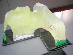 After extrusion, the sheet is perforated, die-cut and coated. Orfit utilizes a water-soluble special anti-stick coating that prevents adhesion of the mask to the patient's skin and hair. The company is also introducing a new anti-bacterial coating in Europe and Asia. Both the thermoplastic material and the coating are biodegradable and support environmental efforts.