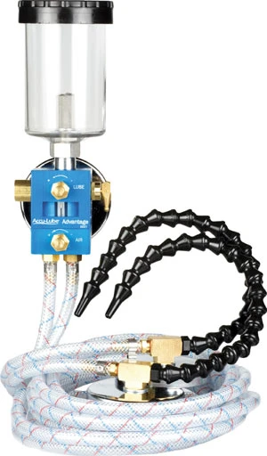 Accu-Lube's applicator is ideal for shops interested in getting started with minimum quantity lubrication. The heavyduty magnetic base and easy-to-use controls on this applicator makes it a breeze to install and operate. The easy portability of this unit is great in shops where operators move in between different machines because the Advantage Applicator can easily move with the machinist to service all of his operations. With the Accu-Lube Advantage Applicator there is no fluid maintenance and no disposal costs to worry about. And by using MQL shops are able to eliminate wet, messy flood coolants which produce dangerous mists that are harmful to operators and create rust on parts and machines. The Accu-Lube Advantage Applicator is available in one- and two-nozzle models.