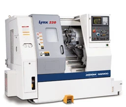 The new Lynx 220 features speed and power in an O.D. turning center. Three models are available, the 220A with a 6.5 in. chuck, the 220C with an 8.25 in. chuck, and a 220LC with an 8.25 in. chuck and elongated bed. All are powered by a 20 Hp motor that allows for heavy cuts through tough metals.