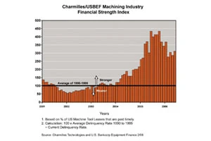 The October 30-day delinquency rate on machine tool leases was about 2%, which is lower than the 2.3% delinquency rate on home mortgages. The Agie Charmilles/USBEF Machining Industry Financial Strength Index was 294 vs. 345 in September 2006, 435 in October 2005, and 55 in January 2002. The January 2002 reading was the lowest reading on record. Any reading above 100 indicates that US Bancorp Equipment Finance's (USBEF's) machine tool lease payment delinquencies are at a rate below the average rate of 1990 to 1999. As profitability rises, liquidity rises, delinquencies fall and the index rises. Historical data is available at the Charmilles URL: www.charmilleus.com/newsroom/bizindes.cfm.
