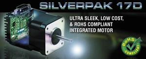 Now available is the RoHS compliant version of the SilverPak 17D product line. The SilverPak 17D is a high torque, two-phase, 1.8° NEMA 17 step motor with an integrated microstepping driver that delivers high performance in a small package. The SilverPak 17D is designed to help reduce overall design time and system cost for a wide array of step motor applications needing high torque and smooth motion. It is available in three body lengths: 2.69", 2.92" and 3.24", and is capable of up to 85oz/in of holding torque depending on the stack size of the motor. T he SilverPak 17D also features: