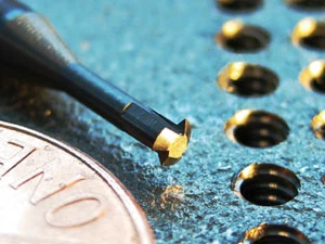 Miniature solid carbide thread mills are optimally-designed for easy machining of difficult materials such as stainless steels, titanium, K-monel, hastelloy, and Inconel. For maximum efficiency and cost savings, the thread mills eliminate the possibility and consequences of tap breakage. Thread mills are available in both one-flute and three-flute versions, with the latter being ideal for high volume output needs. The new thread mills remove costly manual operations by eliminating the need for hand tapping during full bottom threading applications. Bottom threading can be performed to within 1 pitch. The miniature thread mills function highly efficiently with externally supplied coolant and eliminate the need for thread cutting oil, so parts and coolant reservoirs are not contaminated, as can be experienced when using a tapping method in difficult materials.
