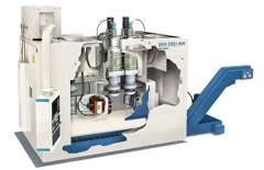 Hessapp's DVH 250 i duo vertical pickup turning center is designed for high-volume production applications. It has a work envelope of 11.8 x 7.9 i n . ( 3 0 0 x 2 0 0 mm) and requires 64.6 square feet (6 m²) of floor space. The DVH250i duo turning center is designed to machine parts up to 9.8 in. (250 mm) in diameter, and has a shuttle-type part feeder to ensure fast part loading times. Axis traverse rates are 1,772 ipm (45 m/min) in the X direction and 1,181 ipm (30 m/min) in the Z direction. The twin spindle design allows parallel production of two identical parts simultaneously, or parallel production of two different parts. The DVH250 i duo turning center can also be used to sequentially process a single part by moving it from spindle to spindle. In parallel production, typical parts can be machined at rates up to 200 parts per hour. Each of the two machining areas can be equipped with a 12-position tool turret for static tools. Powered tools are optionally available. The standard tool interface is VDI 40 to DIN 69880.