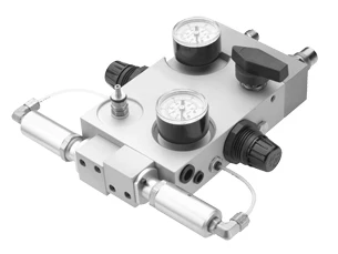 To meet the customer's device size requirements, Humphrey developed a custom manifold that incorporated a manual needle valve flow control, regulators, gauges, shutoff valves, filters and check valves.
