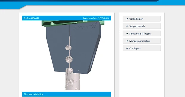 SCHUNK eGrip is a browser-based, license-free application to create and order tailor-made gripper fingers in just a few mouse clicks. Users just have to upload STEP or STL data of the part to grip, and add specific information such as weight, gripper base, mounting direction and relative position of the part to the gripper. The software automatically configures the gripper fingers around the part, generating the optimal finger design, and immediately gives price and estimated delivery information.