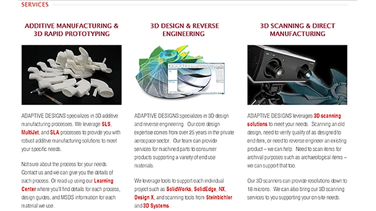 Adaptive Designs features the latest technology in 3D scanning to render an object as a 3D model. Siemens NX, SolidWorks, SolidEdge, and Design X are used as tools to help customers get projects completed quickly and efficiently. Any project can be adapted to a customer’s needs. A wide range of processes and tools for rapid prototyping are used – direct digital manufacturing, 3D printing, 3D scanning, and traditional processes such as machine services.