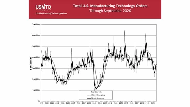 U.S. Manufacturing Technology Orders (USMTO) totaled $373.7 million in September 2020, an increase of 26.4% from August 2020, and the highest monthly total of the year, according to the latest U.S. Manufacturing Technology Orders report published by AMT – The Association For Manufacturing Technology. The September total decreased 3.2% from September 2019, and orders to date reached $2.32 billion, nearly a quarter lower than the 2019 YTD total.