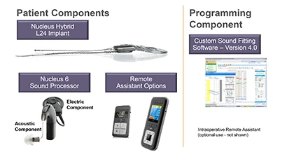 The Nucleus Hybrid L24 Cochlear Implant System combines the functions of a cochlear implant and a hearing aid. This electronic device consists of an external microphone and speech processor that picks up sounds from the environment and converts them into electrical impulses. The impulses are transmitted to the cochlea through a small bundle of implanted electrodes, creating a sense of sound that the user learns to associate with the mid- and high-frequency sounds they remember. The hearing aid portion of the device is inserted into the outer ear canal like a conventional hearing aid, and can amplify sounds in the low-frequency range.