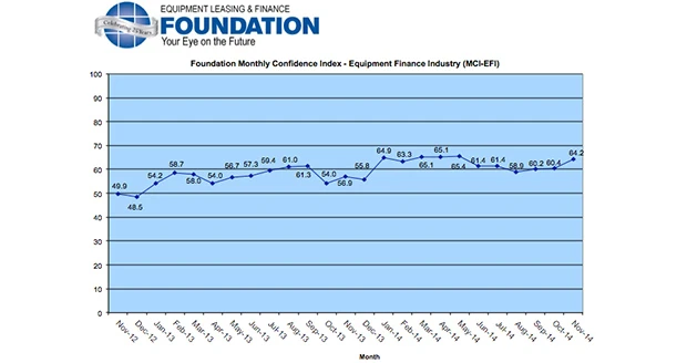 Washington, D.C. – Equipment Leasing & Finance Foundation officials released the November 2014 Monthly Confidence Index for the Equipment Finance Industry (MCI-EFI). Designed to collect leadership data, the index reports a qualitative assessment of both the prevailing business conditions and expectations for the future as reported by key executives from the $903 billion equipment finance sector. Overall, confidence in the equipment finance market is 64.2, an increase from the October index of 60.4 and the highest level since May.