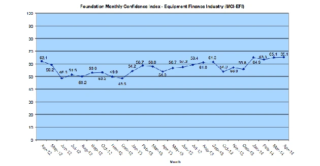 Washington, DC – The Equipment Leasing & Finance Foundation (the Foundation) released the April 2014 Monthly Confidence Index for the Equipment Finance Industry (MCI-EFI). Designed to collect leadership data, the index reports a qualitative assessment of both the prevailing business conditions and expectations for the future as reported by key executives from the $827 billion equipment finance sector. Overall, confidence in the equipment finance market is 65.1, remaining at the highest index level in two years for the second consecutive month.