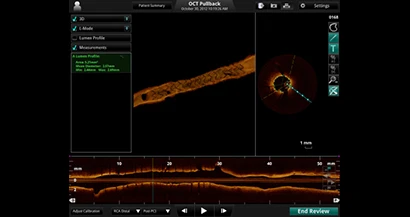 The OCT technology in the new ILUMIEN OPTIS system uses the Dragonfly Duo Imaging Catheter to capture near-infrared light imaging and measure important vessel characteristics otherwise invisible or difficult to assess with older imaging technology. When used with the ILUMIEN OPTIS system, the Dragonfly Duo catheter offers faster, longer pull-backs, which allow the physician to assess more of the patient’s artery in less time.