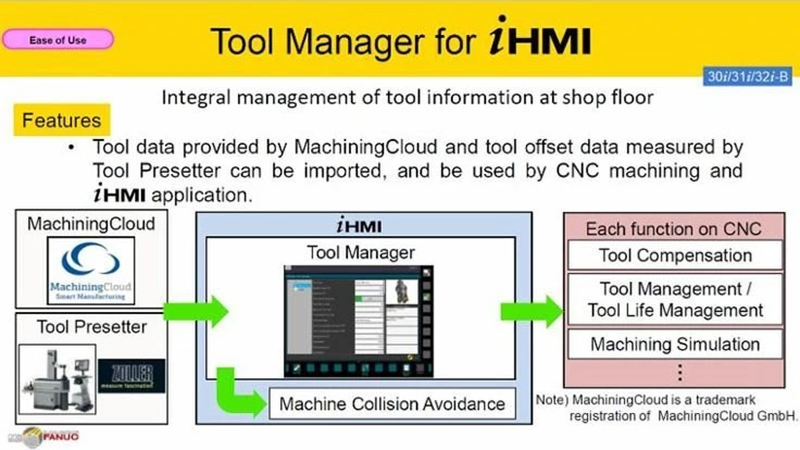 FANUC iHMI is not only function for display but also a kernel platform of making the machine IoT, which has functions of uploading machine and sharing information to upper system. The MachiningCloud, iHMI solution was on display in FANUC Corp.'s booth during JIMTOF 2016 at Tokyo Big Site, Japan. This partnership will integrate management of tooling resources within one platform. Tool data provided by MachiningCloud and tool offset information measured by tool presetters, such as Zoller, also a MachiningCloud partner, can be imported and used by CNC machining and iHMI.