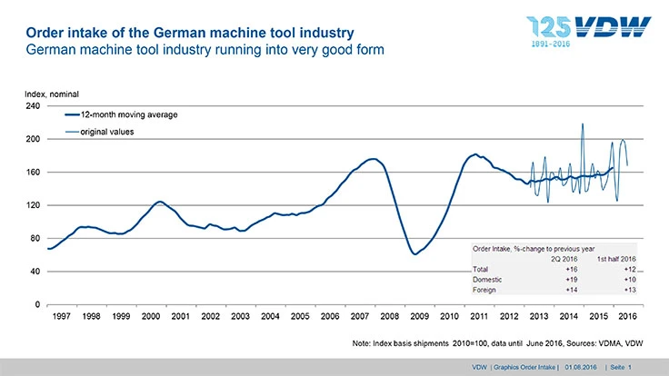 Frankfurt am Main, Germany – In the second quarter of 2016, order bookings in the German machine tool industry rose by 16% compared to the preceding year’s equivalent period. Domestic orders were up by 19%, while demand from abroad increased by 14%. The eurozone contributed growth of 37%, and non-eurozone nations a ten-per-cent rise in orders. In the year’s first half, order bookings increased by a substantial twelve% compared to the preceding year’s figure. While domestic order bookings rose by ten%, orders from abroad were also up, by 13%.