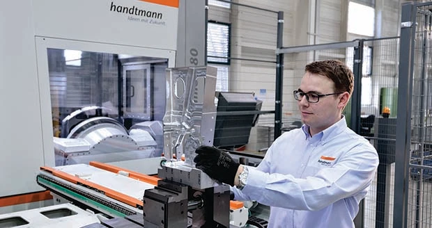 After beginning in window and facade construction, industries such as mold and die, tool making, automotive, and especially the aerospace industry began using Handtmann A-Punkt machines. The company is able to cover a broad range of applications in profile machining, small parts below 800mm to large plates up to 50m in length and workpieces with deep pockets. Handtmann also developed a wide expertise in materials as from lightweight up to heavy duty machining.