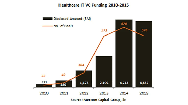 The top VC funding rounds in 2015 were Chinese company Guahao’s raise of $394 million, NantHealth’s $200 million round, ZocDoc’s $130 million raise, followed by Virgin Pulse’s $92 million raise. Practo was next with a $90 million round, Collective Health raised $81 million, and Health Catalyst brought in $70 million.