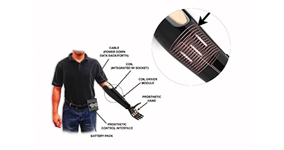 The IMES System takes advantage of electro-chemical signals that occur when a muscle contracts. The IMES implants, which are small capsules about 16mm long and 2mm wide, are placed into the residual muscles of an amputated limb, where they detect contractions that are used to elicit specific movements in the part of the limb that is no longer there. These signals are captured and wirelessly transmitted from the implanted sensor to a decoder box, which serves as an electronic brain. The IMES System bridges the brain to the artificial limb, enabling the signals sent from the brain to the remaining portions of the amputated muscles to intuitively control the prosthesis without the need for invasive brain or muscle reinnervation surgery.