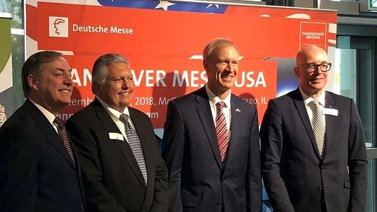 During a press conference at Hannover Messe 2018, (pictured left to right) Peter Eelman, Vice President – Exhibitions & Business Development of AMT – The Association For Manufacturing Technology; Larry Turner, President & CEO of Hannover Fairs USA (organizer of HANNOVER MESSE USA); The Honorable Bruce Vincent Rauner, Governor of the State of Illinois; and Marc Siemering, Senior Vice President of Industry, Energy, Logistics at Deutsche Messe AG (organizer of HANNOVER MESSE) discussed the outlook for manufacturing in the U.S. and the Hannover Messe trade show being staged at IMTS 2018.
