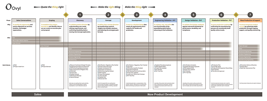 To achieve this balance, Ovyl developed a process framework symbolized by a dotted line down the middle. On the left is “making the right thing”: understanding user needs, technical constraints, and feasibility within the client’s business goals. This stage produces a product intent document (PID), a blueprint defining the development path and identifying potential risks.