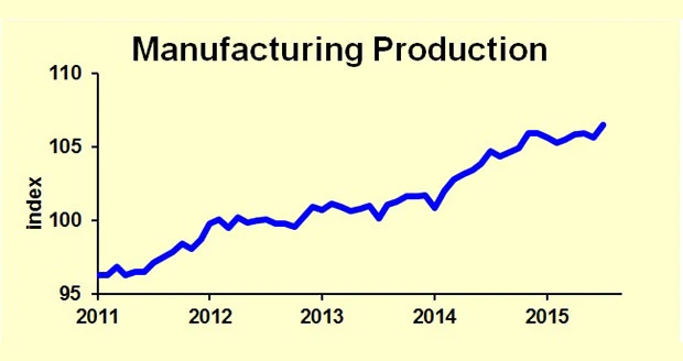 The U.S. manufacturing sector is coming back, we learn from the Federal Reserve’s industrial production report. Last month’s gain was 0.9 percent, more than making up all the ground lost in the early months of this year. Looking forward, production will continue to expand, but don’t expect a lot more factory jobs.