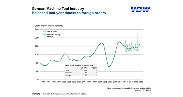 Frankfurt am Main – Orders received by the German machine tool industry in the second quarter of 2015 were 10% up on the previous year's figure. Domestic orders were 3% higher, foreign demand grew by 14%. There was 6% growth in orders from the euro zone, and a 16% increase from non-euro countries. Compared to the previous year, incoming orders stagnated in the first half of 2015. Domestic orders fell by 8%, whereas foreign demand rose by 6%.