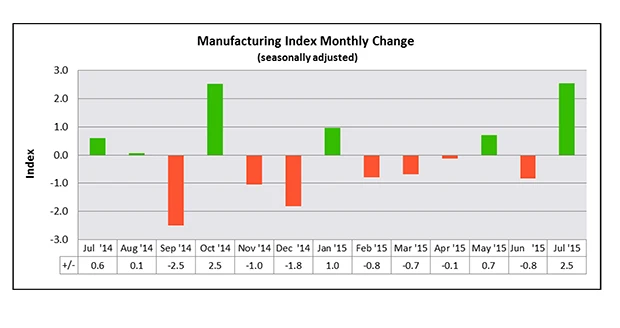 For a full breakdown of the manufacturing and service sector data and graphics, view the complete July 2015 report at http://web.nacm.org/CMI/PDF/CMIcurrent.pdf. CMI archives may also be viewed on NACM’s website at http://www.nacm.org/cmi/cmi-archive.html.
