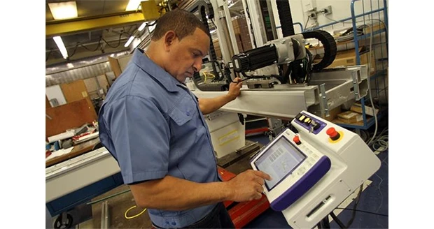 Nicholas Salcedo, a robotics technician, gets a robotic arm ready for shipment at Yushin, in Cranston.