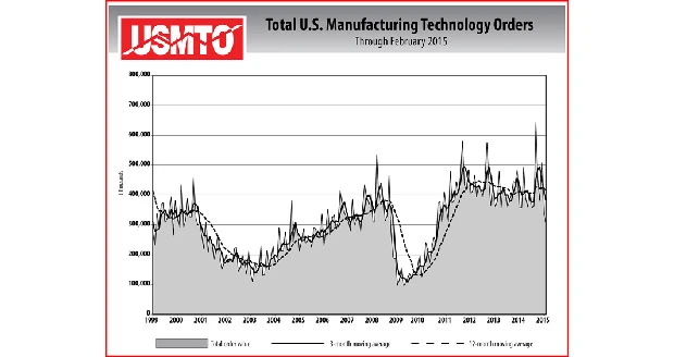 McLean, Virginia – February U.S. manufacturing technology orders totaled $304.74 million according to AMT – The Association For Manufacturing Technology. This total, as reported by companies participating in the USMTO program, was down 10.6% from January’s $341.02 million and down 14.8% when compared with the total of $357.86 million reported for February 2014. With a year-to-date total of $645.76 million, 2015 was down 9.8% when compared with 2014.