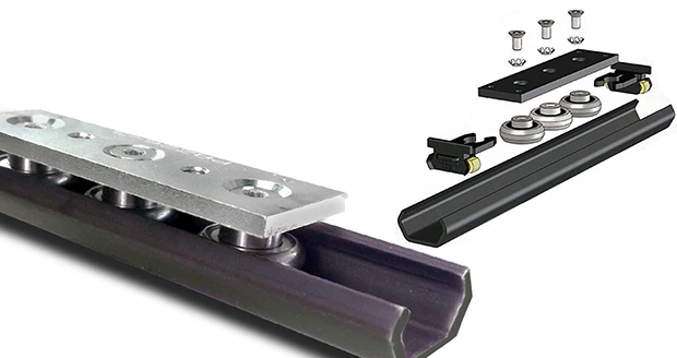The bearing rails are hardened steel with a nitride-plus coating for extended life and superior corrosion protection. Each three bearing roller block or slider unit is 80mm (3.15") long, and is available in 300 series stainless steel (LMBX) or zinc plated (LMBZ). The hardened 52100 bearing steel rollers have lubricated for life bearings with ZZ seals and can be washed down. The slider’s center bearing is mounted on an eccentric shaft for adjusting the preload. The cross section of the compact bearing and slider is only 26mm x 0.22mm (1.02" x 0.866"). The harden steel Nitride-Plus coated rails are available in lengths of 1,040mm (40.94"), 1,520mm (59.84"), 2,080mm (81.89"), and 3,120mm (122.83") or in cut to order sizes.