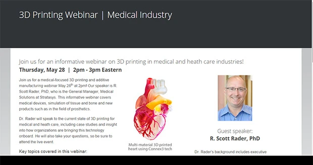 Rader will speak to the current state of 3D printing for medical and health care, including case studies and insight into how organizations are bringing this technology onboard. He will also take questions, so be sure to attend the live event.