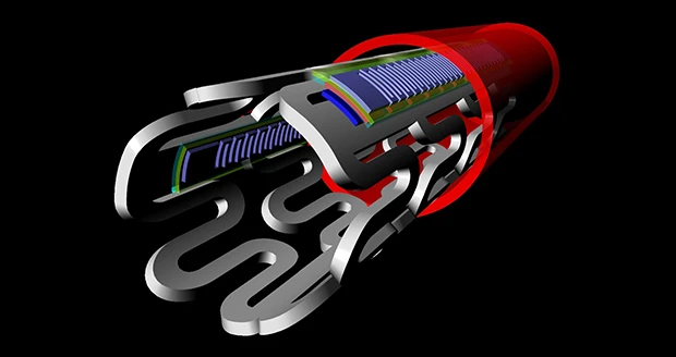 The researchers developed and tested in animals a drug-releasing electronic stent that can provide diagnostic feedback by measuring blood flow, which slows when an artery starts narrowing. The device can also heat up on command to speed up drug delivery, and it can dissolve once it’s no longer needed.