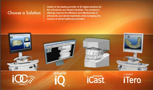 Cadent has a portfolio of best-in-class products and services for restorative dentistry and orthodontics which include the iTero and iOC intra-oral scanners. Cadent's iTero technology provides dentists with a full range of restorative choices, flexibility to choose labs and fabrication processes, and control in providing the highest standard of care for their patients. Cadent's iOC technology, used primarily by orthodontists, ensures a more accurate first impression, enables high value clinical applications and a significantly better patient experience. Cadent also has a range of leading orthodontic services and products including OrthoCAD iQ, OrthoCAD iCast and OrthoCAD iRecord.