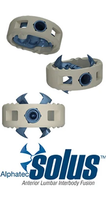 The Alphatec Solus ALIF device features two counter-rotating titanium blades, which deploy into adjacent vertebrae on a zero-degree axis, locking the device in place. This provides four points of fixation, delivered in what the company believes is an industry leading single step. The patented device is designed to provide enhanced segmental stability with a simplified surgical technique, while providing substantial spacing to insert bone graft to help promote rapid fusion at the site. Alphatec Solus is designed to provide fast, easy and effective stabilization for a surgeon's ALIF procedures.