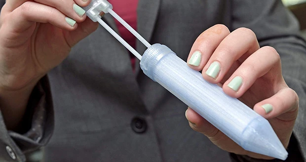 The two chemicals – a polyol and a diisocyanate – that produce the foam remain in canisters that are stored separately within the injector device before they are needed. The students designed the canisters to keep the chemicals stable in military conditions at temperatures up to 100°F for at least one year. The injector is about the size of a whiteboard marker. On the battlefield, the soldier administering the treatment would mix the two chemicals with a mechanism inside the injector. Then, pushing down the plunger would insert the expanding foam into the wound to reduce bleeding.