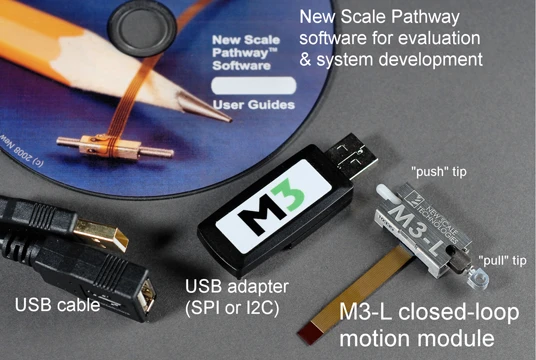 New Scale Technologies today announced that developer's kits for its miniature M3-L closed-loop linear motion module are available for purchase online, shipping from stock, at http://shop.newscaletech.com. Each kit includes an M3-L module for precision closed-loop linear motion, along with a USB adapter and New Scale Pathway software for easy evaluation and prototyping. Configured for I2C or SPI serial interface, the modules in the developer's kits are offered with a bullet nose for pushing and a hook tip for pulling loads up to approximately 0.2 Newtons. Standard travel is 6 mm.