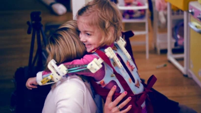 But, Emma progressed, slow and steady. As she grew and became able to move about with the help of a walker, it became clear that her mind was sharp and her determination on par with her mom’s. At two years old, she still could not lift her arms, and the smart little girl wanted more. “She would get really frustrated when she couldn’t play with things like blocks,” Lavelle says. So, the mom would be Emma’s arms for her; playing with blocks, eating, brushing teeth.