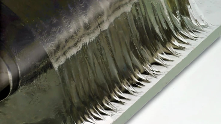 Engineered hydrogel being pulled away from a glass surface. The material shows a property called “tough wet adhesion” comparable to tendon and bone interface. The wavy edge instability at the interface is a hallmark of strongly adhered soft material on a rigid surface. Image: Felice Frankel