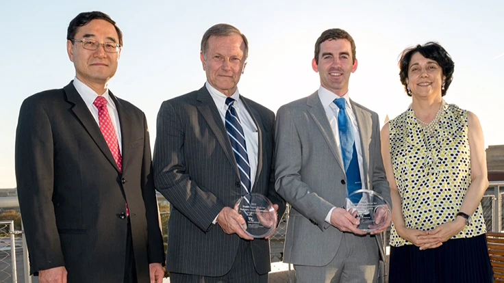AventaMed and Prospiria, Inc. win $50K each in pediatric medical device competition hosted by the Sheikh Zayed Institute for Pediatric Surgical Innovation at Children’s National Health System. (L to R) Peter Kim, MD, Ph.D., Sheikh Zayed Institute; John Vaughan, AventaMed; Donald S. Prough, MD, Prospiria Inc.; Kolaleh Eskandanian, PhD, Sheikh Zayed Institute. Photo: Kaveh Sardari