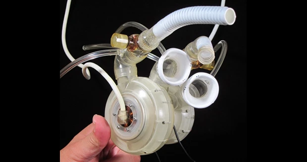 There are two types of artificial heart: the total artificial heart that completely replaces a human heart and the ventricular assist device that is implanted in the human body and complements the pumping capability of an existing heart. The University’s artificial heart development team is working on comprehensive research and development activities focusing on total artificial hearts, and is using PTC Creo to develop a total artificial heart with hydrodynamic levitating impeller, lubricated by the blood in the pump (hydrodynamic bearing), promising remarkable improvement in durability. In 2008, a goat with an implanted total artificial heart survived 153 days, setting the survival record in Japan. The team also succeeded in keeping a goat alive for 532 days with a pneumatically-driven total artificial heart that consists of a blood circulation pump and a power unit outside the body, which is still the longest worldwide survival record for total artificial heart animals.