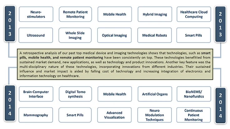 Analysis from Frost & Sullivan, Top Medical Device and Imaging Technologies in 2015, reveals growth in the healthcare industry will center around the following 10 technologies: surgical robots, digital pathology, neuroprosthetics, surgical laser, smart pills, optical imaging, health informatics, integrated vital signs monitoring, artificial organs and four-dimensional (4D) ultrasound imaging. New modalities such as neuroprosthesis and hybrid imaging are moving towards commercialization. Technologies already in the early commercialization phase, including smart pills and surgical robots, will find widespread uses across applications.