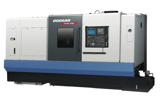 With a generous 10.8” through-hole diameter, plus 60 Hp of turning power…3,293 ft-lbs spindle torque…up to 6,102 lbs Z-axis thrust…and optional self-centering chucks that can be front and rear mounted, Doosan’s new Puma 480D is designed specifically for oil-field applications. But it has all the power, speed and precision to produce any parts within its 25.6” diam. x 39” long (80.4” optional) work envelope.