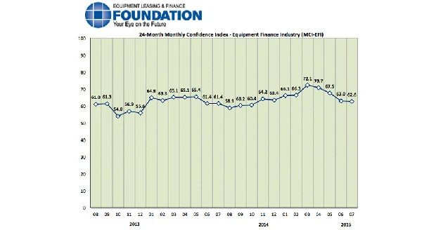 Washington, DC –- The Equipment Leasing & Finance Foundation’s June 2015 Monthly Confidence Index for the Equipment Finance Industry (MCI-EFI), designed to collect leadership data, reports a qualitative assessment of both the prevailing business conditions and expectations for the future as reported by key executives from the $903 billion equipment finance sector. Overall, confidence in the equipment finance market is 62.6, remaining essentially the same as the June index of 63.0.